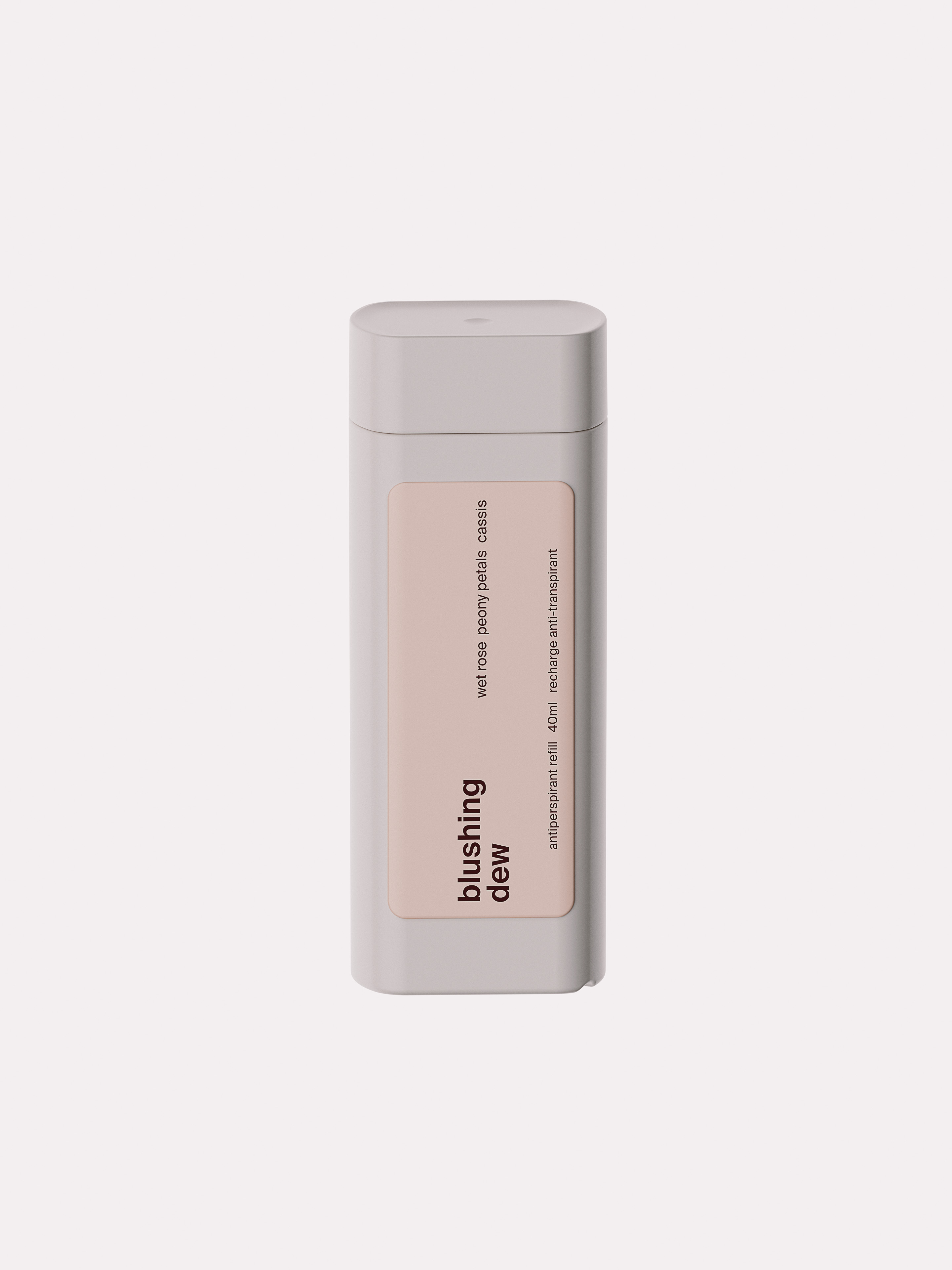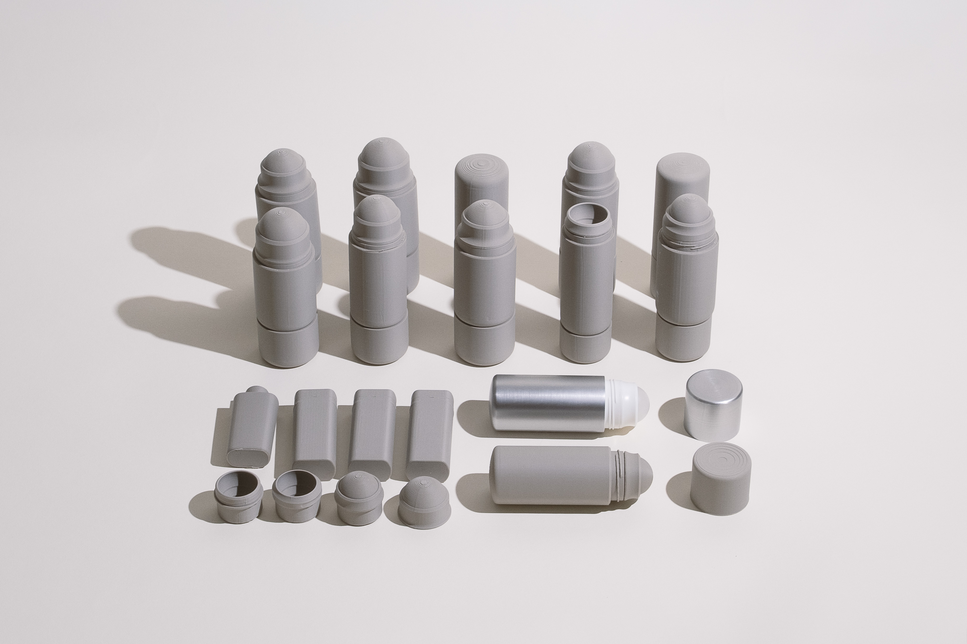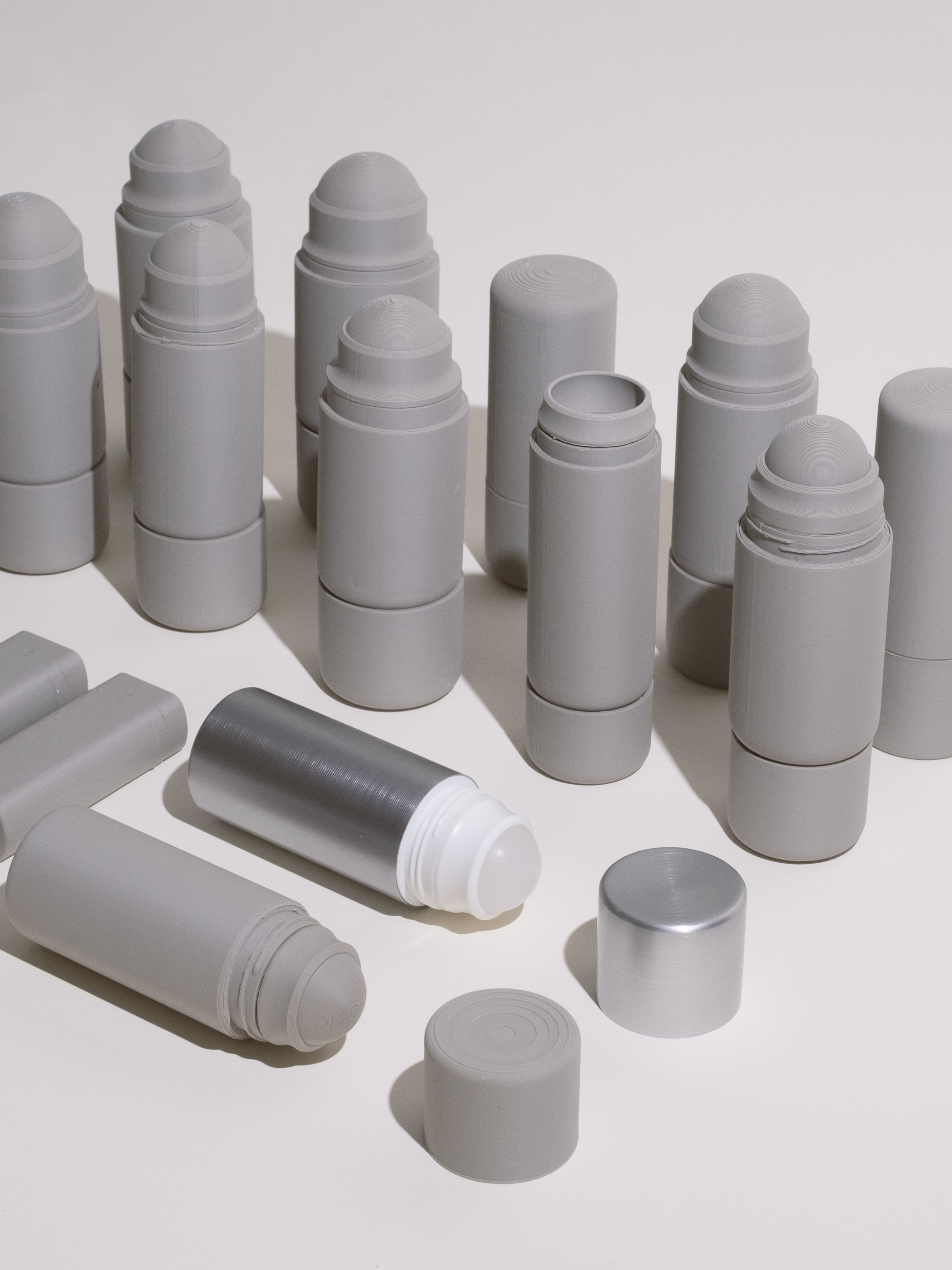 A simple cylindrical body is finished with mirrored endcaps, encouraging the deodorant to stand upright with the ball facing down so that the tip is always ready to go, already primed with product. The threaded cap creates a sealed, leak-proof system that travels well, while the refill cartridge snaps in vertically, reinforcing the difference between opening and reloading.